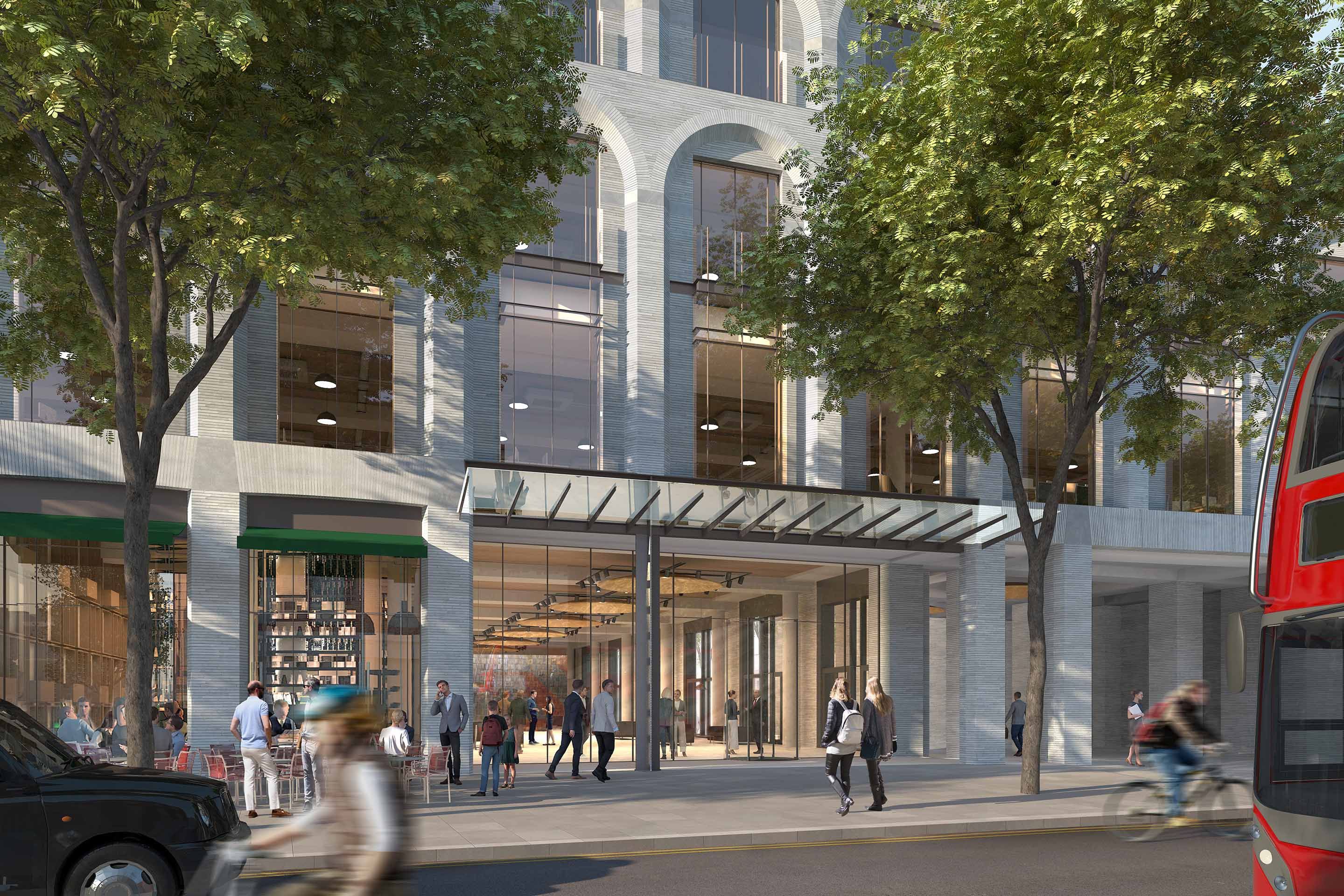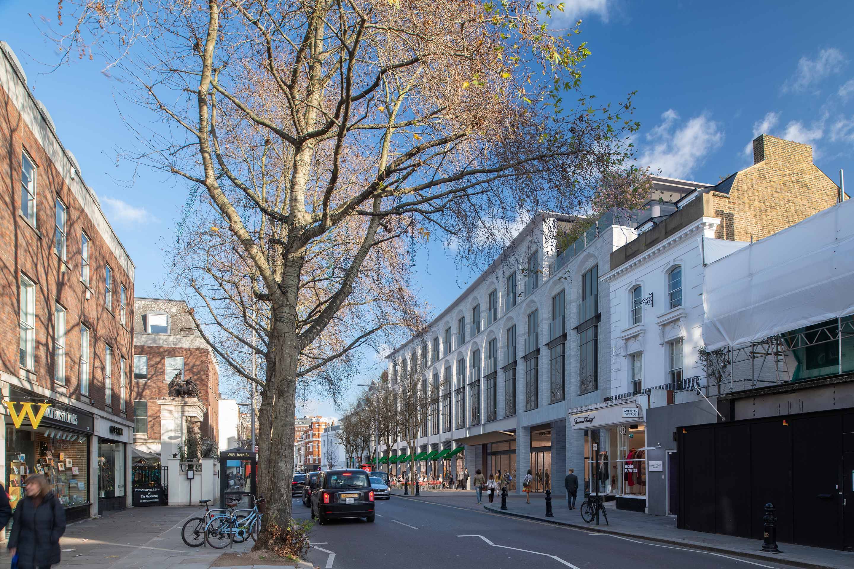 81-103 King’s Road reimagines this underutilised commercial site close to Sloane Square as a mixed-use development, delivering best-in-class sustainable workspace and generous ground floor retail space, adding vitality to the urban environment and enhancing the surrounding conservation area. Our proposal retains the site’s large-scale anchor retailer while introducing space for a secondary retail offering at street level. Three levels of office accommodation will sit above, including a generous dual aspect office lobby overlooking the high street. Facing onto the King’s Road, the scheme’s primary frontage will form a gentle crescent, providing a more generous public realm, landscaped with new street trees and greenery. A high-quality elevation of white Roman brick and Portland stone, inspired by the heritage context, features retractable awnings above the retail frontage as well as arched windows above. To preserve neighbouring sunlight, the upper floors are set back from the main shop frontages, creating a distinctive stepped profile. As well as creating different workplace sizes for a mix of tenants, this set back introduces generously planted terraces that will help green the neighbourhood and lend outdoor breakout space to each floor. An access core in the middle of the plan will ensure flexible space configurations and generous daylighting throughout. The scheme will retain and re-use the basement of the existing late 1980s office block, leading to considerable carbon savings, while high-quality building fabric combined with efficient building systems is set to place the scheme within the 6% most energy efficient buildings in the country.