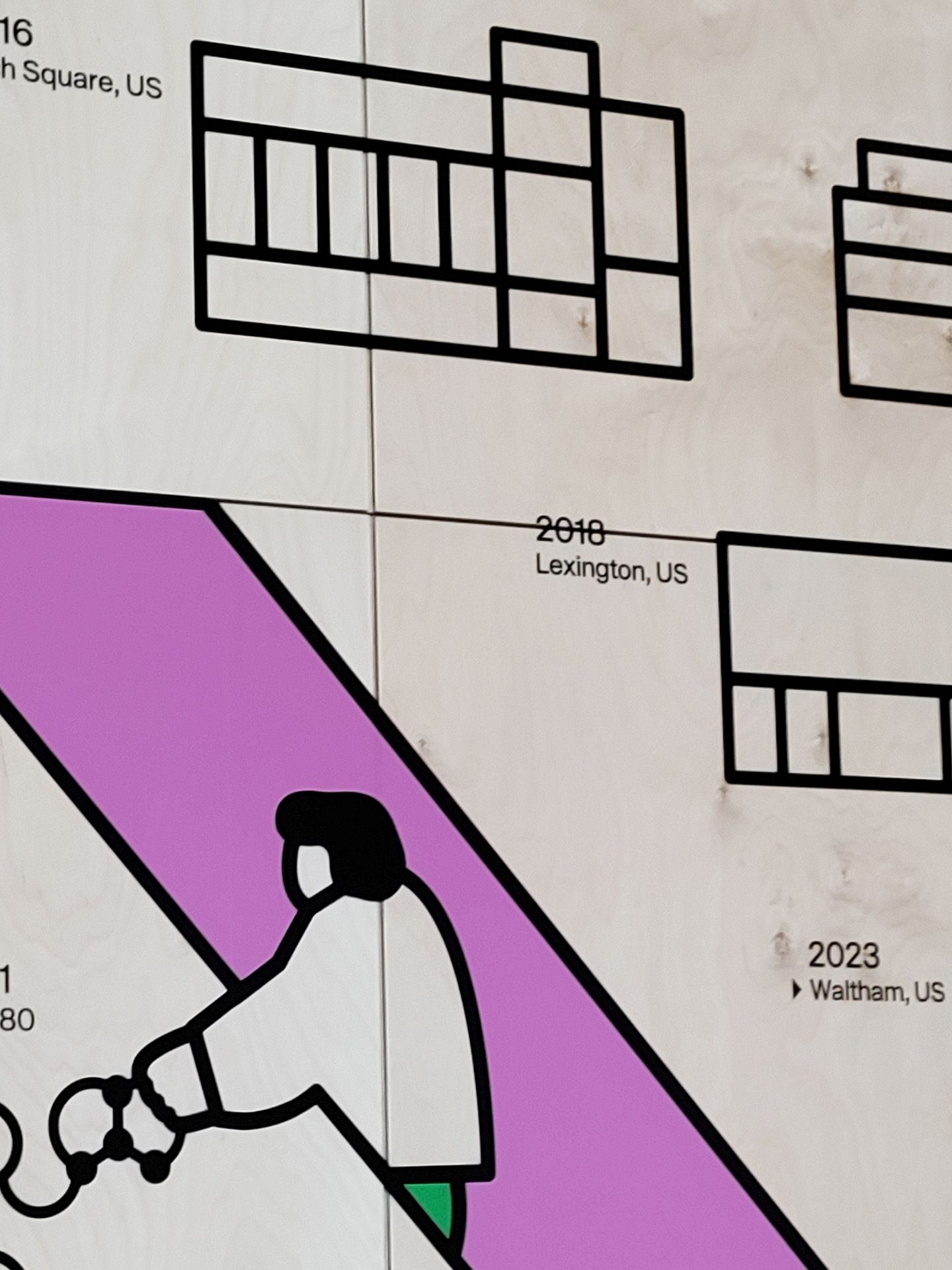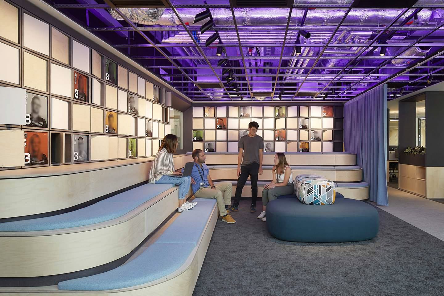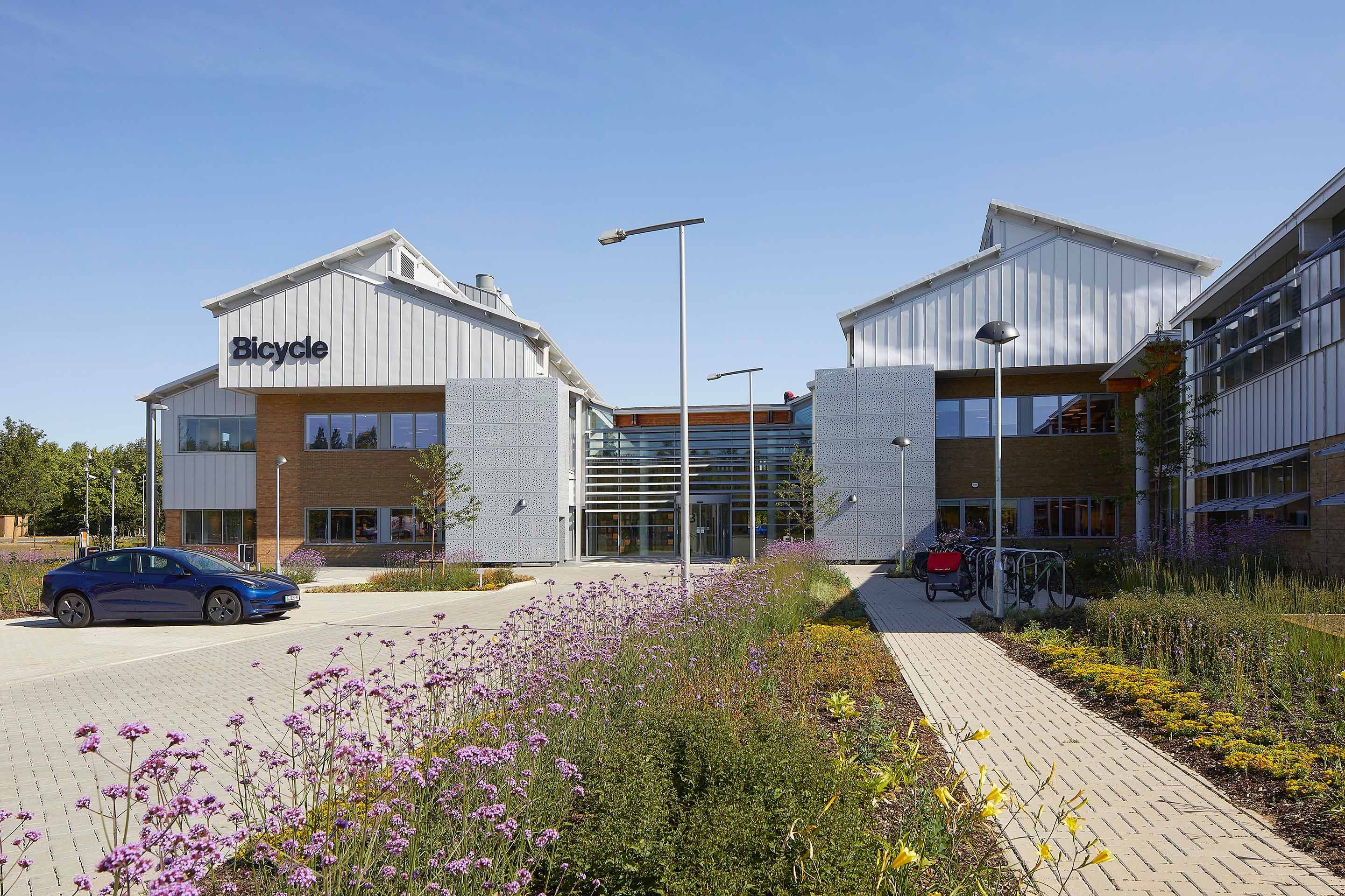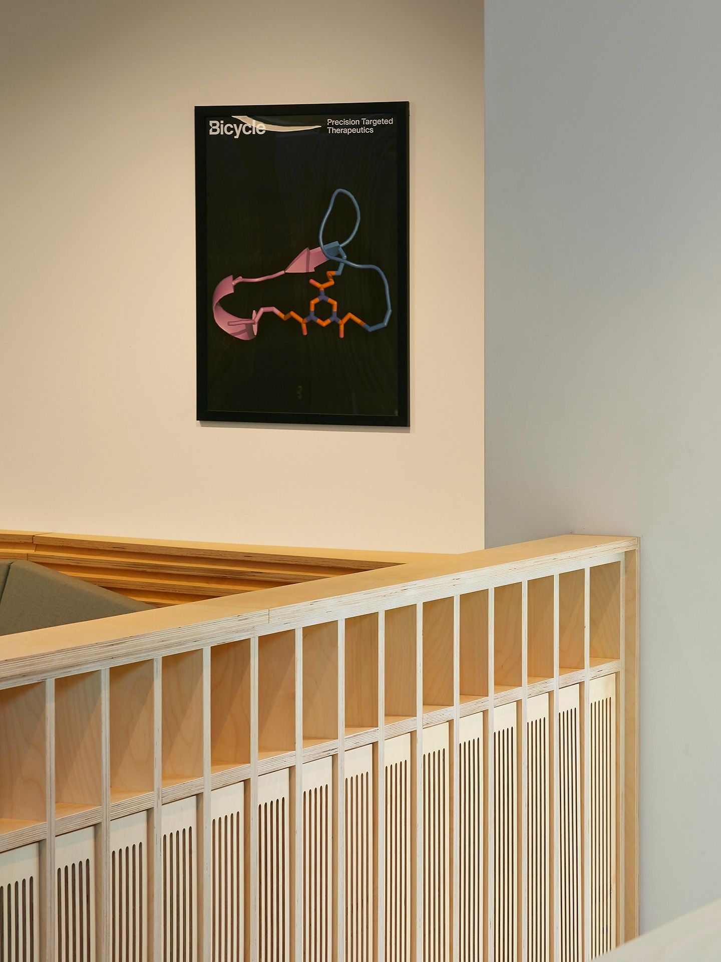 Bicycle Therapeutics in Cambridge reimagines the spaces in which scientists and researchers come together to discover new life-saving medical treatments. Reworking its web labs, write-up and administrative spaces, we created an agile, activities-based workplace, accommodating the rapid growth of this life sciences start-up. By removing a dense grid of compartment walls and establishing sight lines across a double-height entrance lobby, we increased the flexibility of the floorplans, creating bright workspaces, and enhancing connections across different departments. Existing laboratories were modernised in situ to retain existing service configurations, offering substantial time and cost savings. At the heart of the workspace, we created an informal meeting and collaboration zone with bespoke tiered seating, encouraging in-person collaboration between colleagues. In addition, we customised meeting rooms for remote collaboration between the company’s UK and US teams. Timber panelling and natural accents across the workspaces create a healthy, welcoming environment for employees and visitors alike, and to subtly brand the reception area, we created a bespoke graphic featuring the company’s global pharmaceutical patents, including its signature drug delivery proteins (‘bicycles’). To complement the office’s lofty entrance and reception area, we created a landscaped garden space to offer outdoor amenity and enhance user wellbeing.
