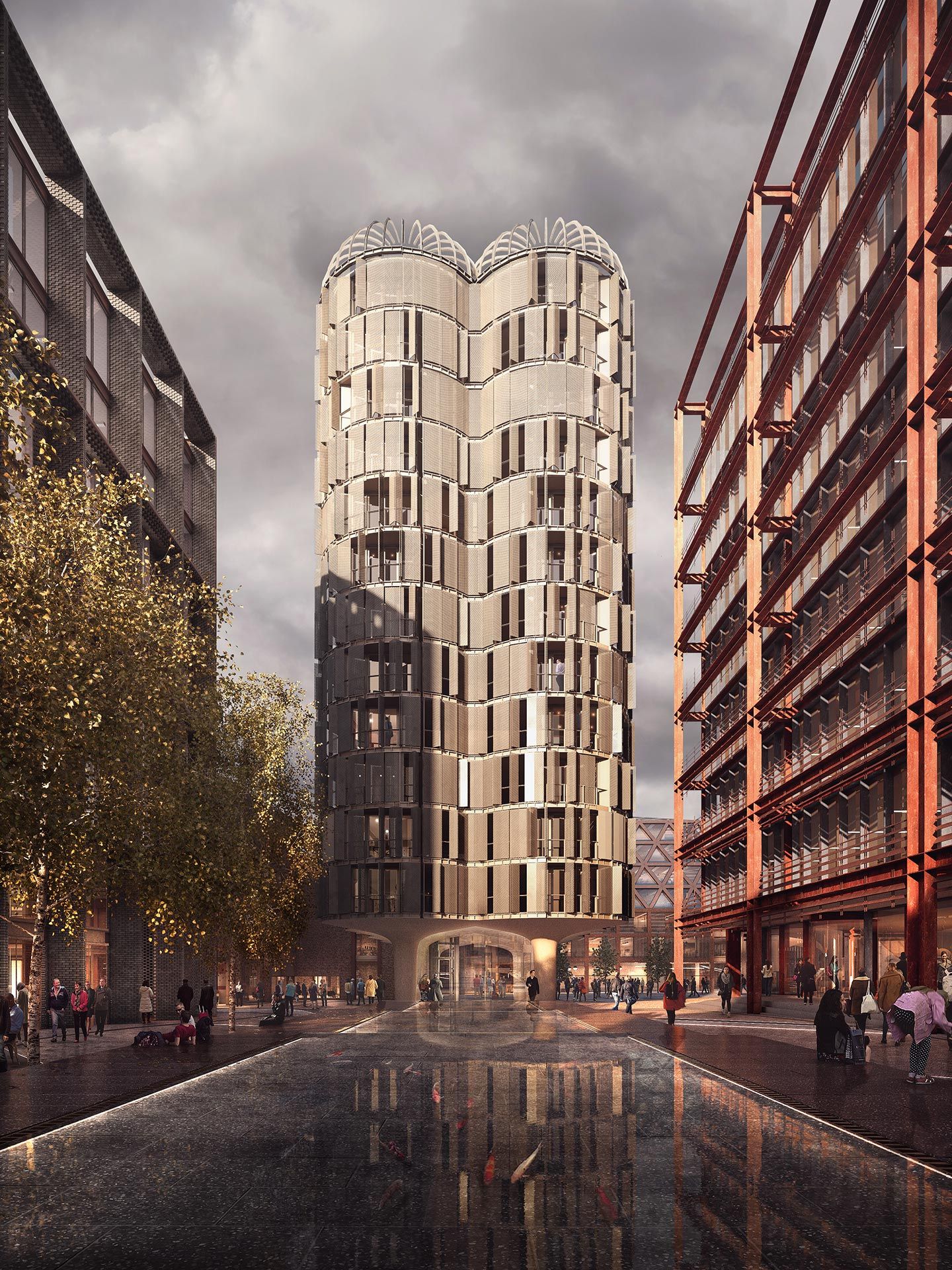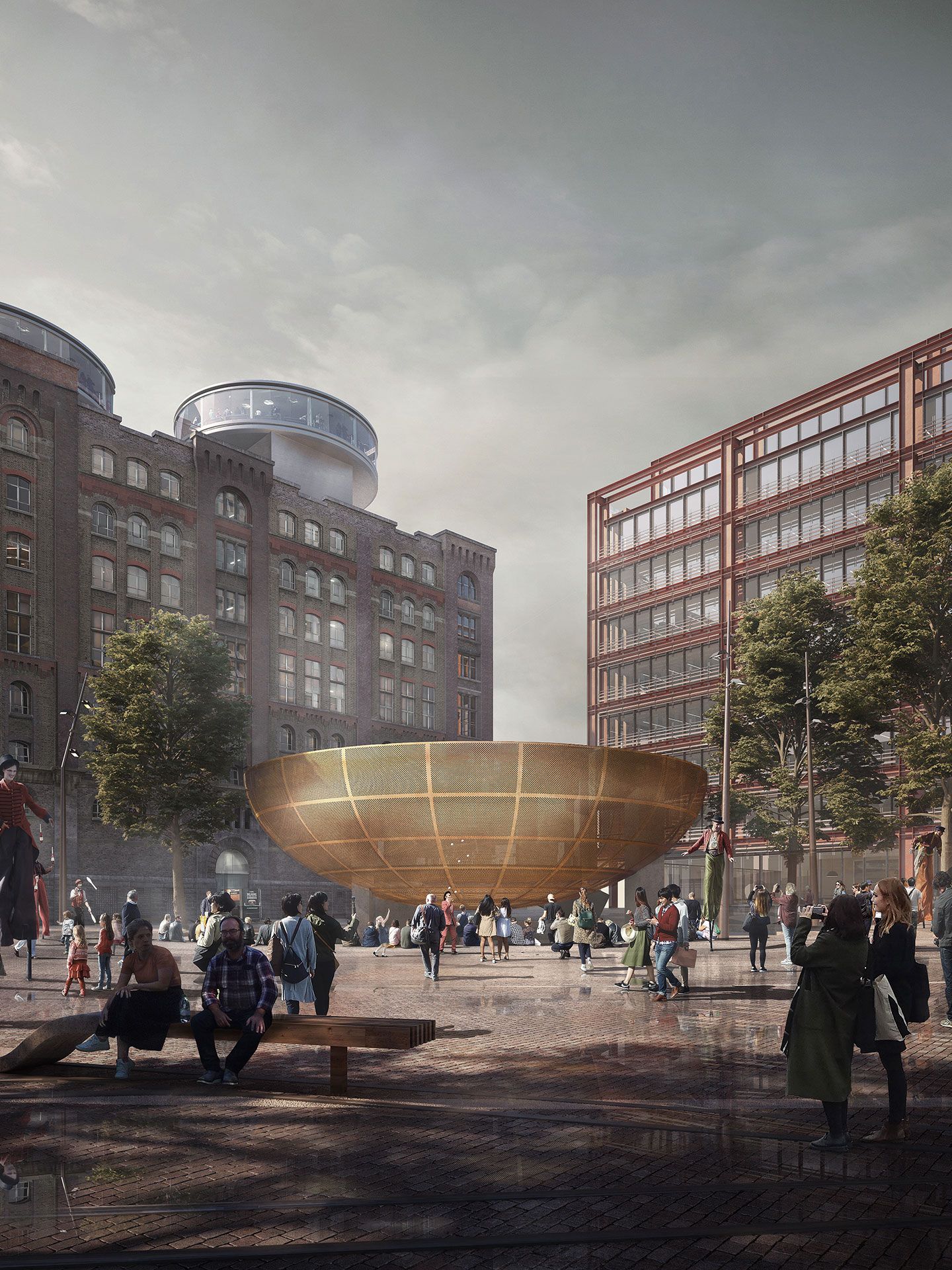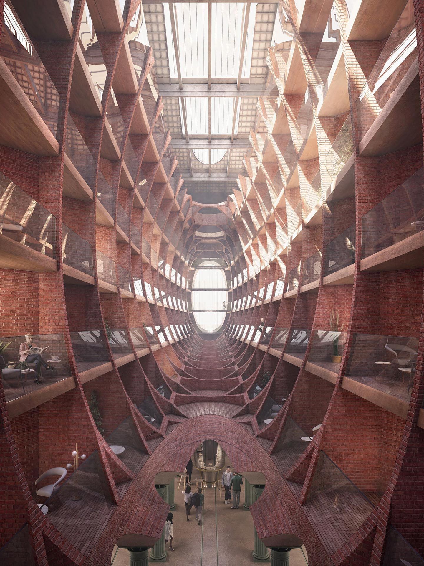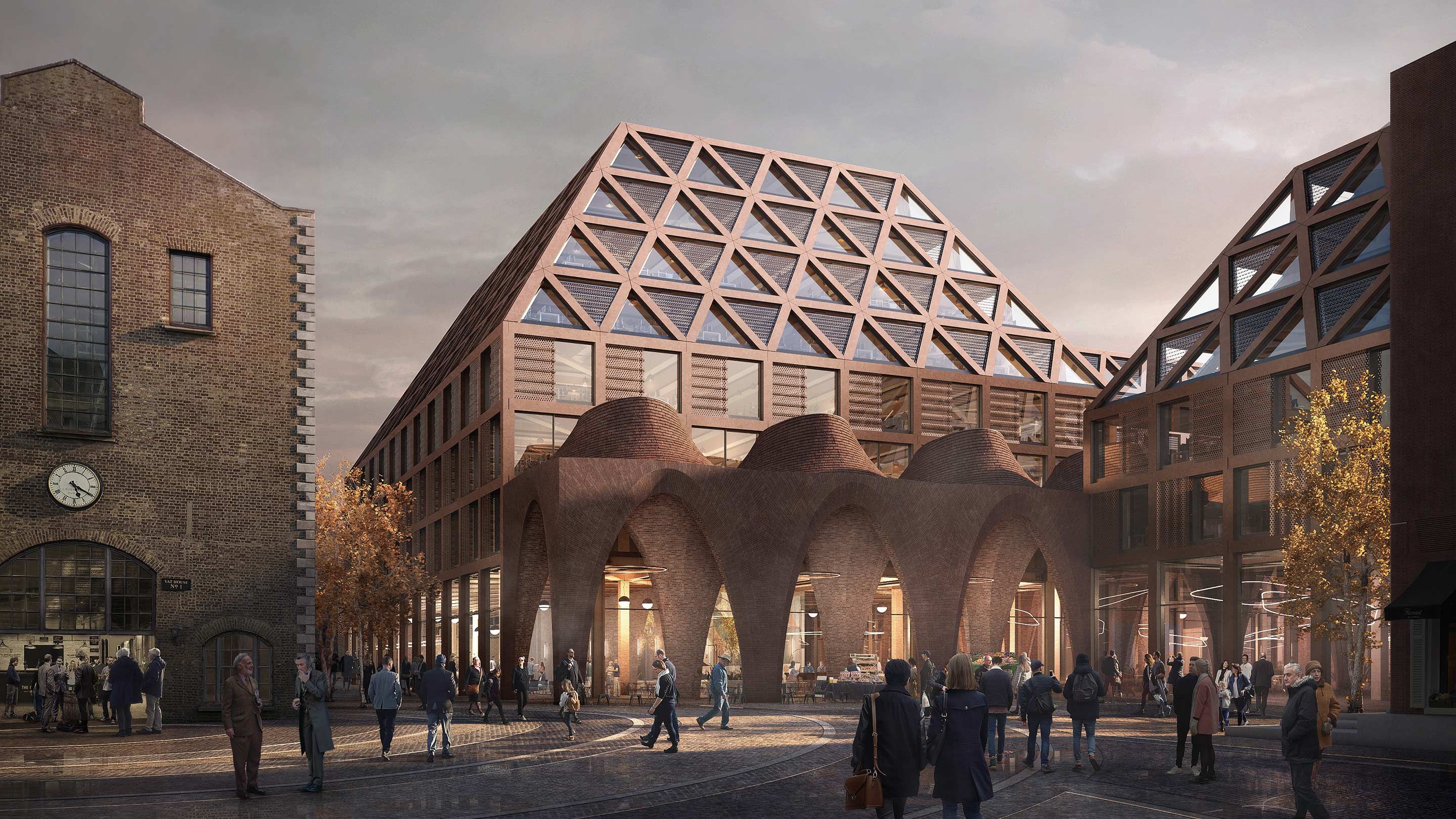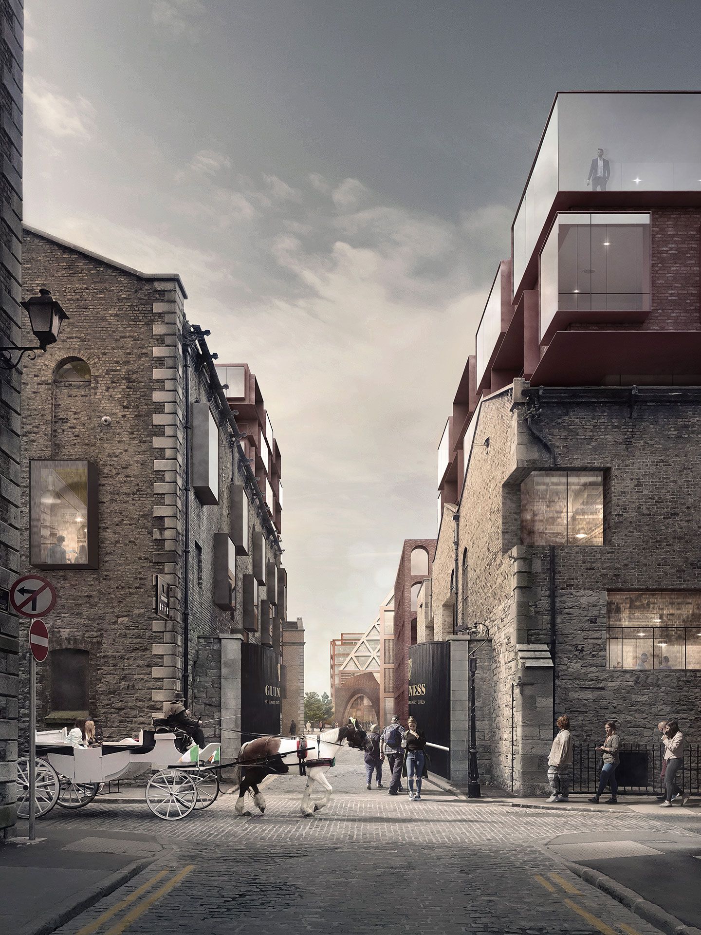 Our proposal for St James’ Gate brewery looks to transform Guinness’ landmark site into a lively, mixed-use urban district while retaining and enhancing its unique industrial heritage. Set in The Liberties, a centuries-old neighbourhood in west Dublin, our masterplan establishes a network of fine-grained laneways and squares reminiscent of the surrounding Georgian city. To guarantee a new urban quarter visibly shaped by its past, we identified over 20 buildings, including brew houses, cooperages, and hop and grain stores to retrofit and accommodate the new programme, comprising commercial, residential and cultural functions. Their retention will represent a legacy of engineering innovation pursued by Guinness over the last three centuries. For instance, as part of our scheme, Brewhouse 3, Ireland’s largest cast iron building when it completed in 1879, will serve as Diageo’s new headquarters. Newly built structures inspired by the site’s history will act as significant placemaking markers within the district. The former brewery main entrance gates will lead to a new urban square with an adjoining central Market Building. Constructed with pyramidal timber roof volumes set atop a vaulted brick plinth, the building will provide a covered pedestrian link leading to the larger Storehouse Square, with the iconic refurbished Guinness Storehouse as its backdrop. An adjoining contemporary residential building, modelled on stainless steel brewing vats, will feature filigree perforated stainless steel shutters filtering light to generous terraces at its perimeter. Opposite, a new copper-clad auditorium will serve as a multipurpose venue, designed to spill out and animate the public realm.