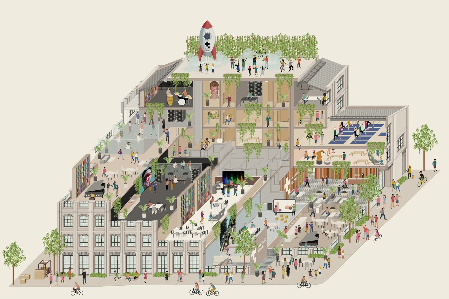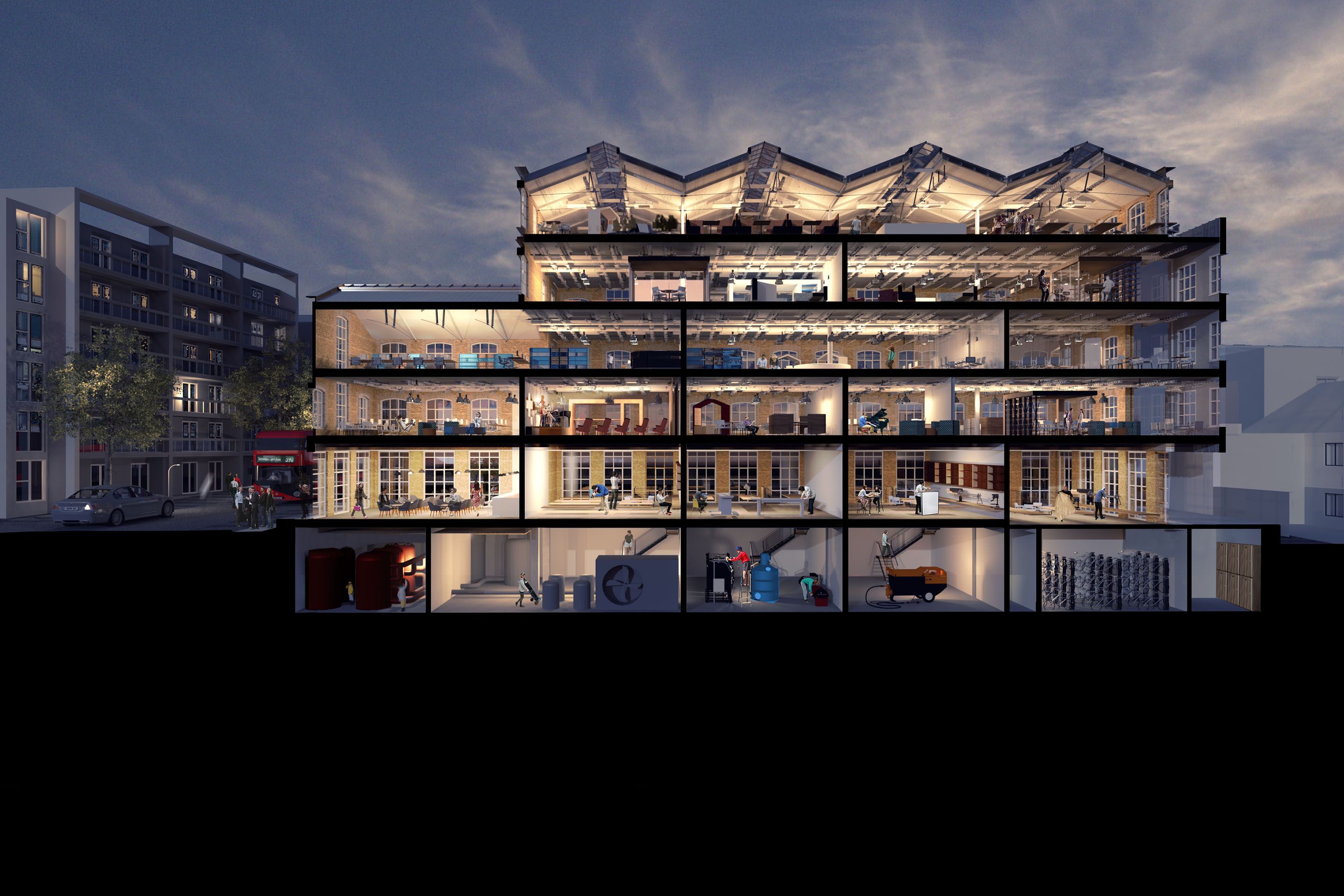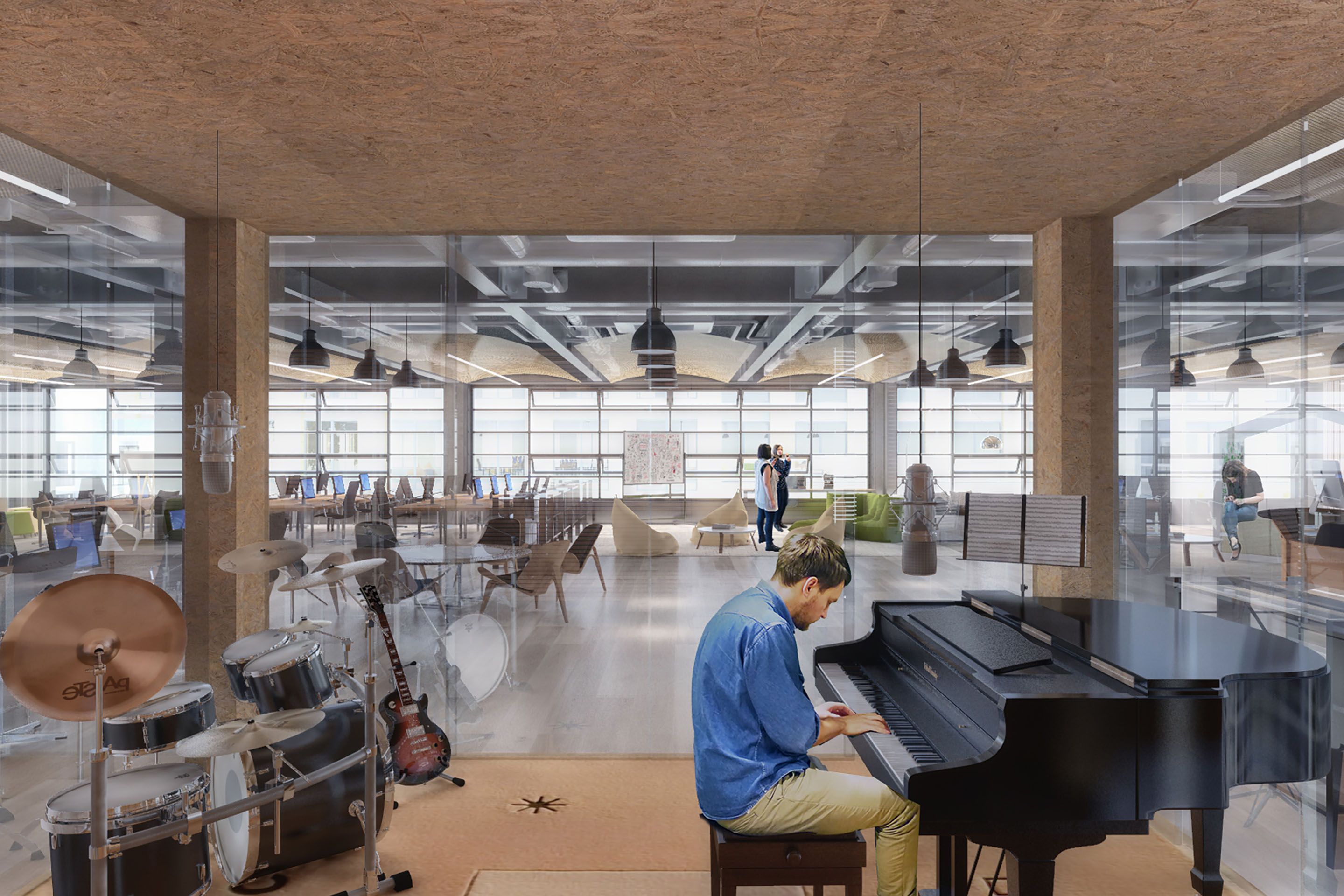 Tileyard Studios are a new force in London’s music industry, with a cluster of 400 leading businesses in performance, management, production and technology. Pilbrow & Partners have been commissioned to provide a masterplan to guide the future growth of Tileyard’s Kings Cross Estate. Pilbrow & Partners secured consent on behalf of Tileyard Studios for a 70,000sqft NIA flexible workplace building in Kings Cross. Tileyard have grown over the last decade to become Europe’s largest music and entertainment cluster. Much of this growth has been within existing buildings and Tileyard have struggled to deliver larger scale specialist recording studios to the highest acoustic and operational standards. The new building, with its generous clear heights and open structural grid, meets this need. The practice is designing two buildings in detail within this framework: a flexible workplace on York Way and a state-of-the-art symphonic recording studio on Vale Royal. The studio will double as an event space and is set at the heart of a range of new facilities to support companies on the site including health, exhibition, hotel and conference space. A new Club forms the apex of the proposed building. The new workplace building on York Way will do more than meet the growing demand for space generated from the success of the existing Tileyard Campus. Much of the current accommodation has had to be created in existing buildings which are compromised in terms of their flexibility, design and performance. As companies grow, they demand larger floor plates to facilitate communication. They also look to increase the quality of their working environment and both ambitions are met by the new Tileyard Studios building. The Tileyard studios building is designed to provide the flexible and environmentally sustainable workplace sought by leading companies in the creative sector. Bright, light and tall studio floors are served from an offset side core set on the southern boundary. The building adopts innovative and progressive environmental strategies to deliver a low energy healthy workplace. A displacement ventilation system allied to exposed structure minimises the building’s energy requirements. Considerations of health and well-being inform the decision to allow a high degree of individual control over the building’s internal environment. Windows can be opened avoiding the need for comfort cooling in mid season.